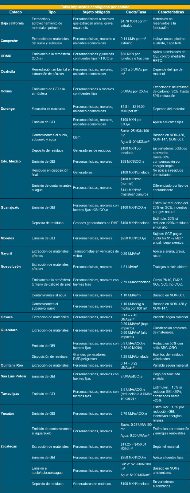 En la siguiente tabla se muestran los principales impuestos ecológicos por estado, así como sus principales características: cuotas o tasas, sujetos obligados y el tipo de impuesto.